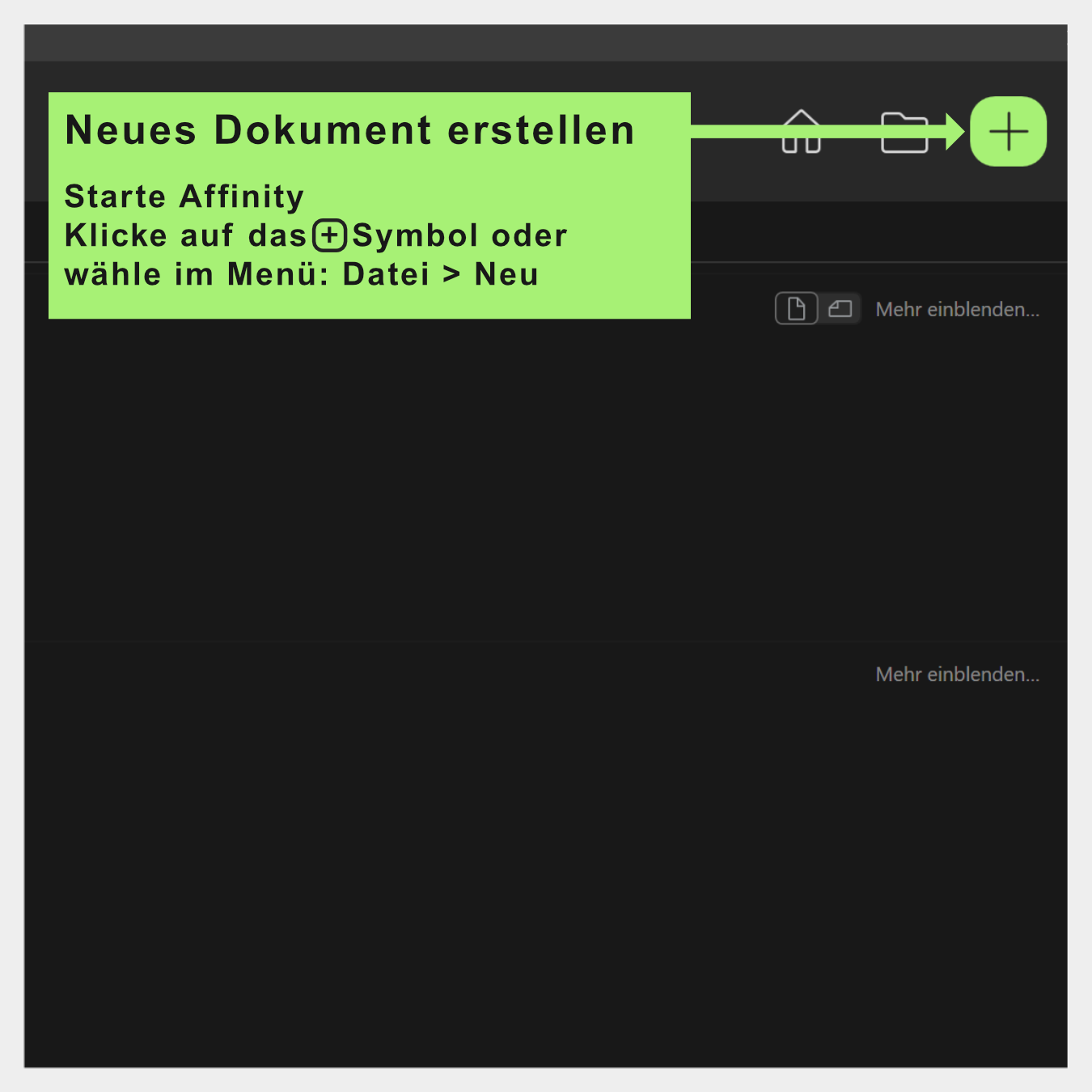 - Installiere und starte Affinity und erstelle mit dem Plus-Zeichen rechts oben ein neues Dokument.
