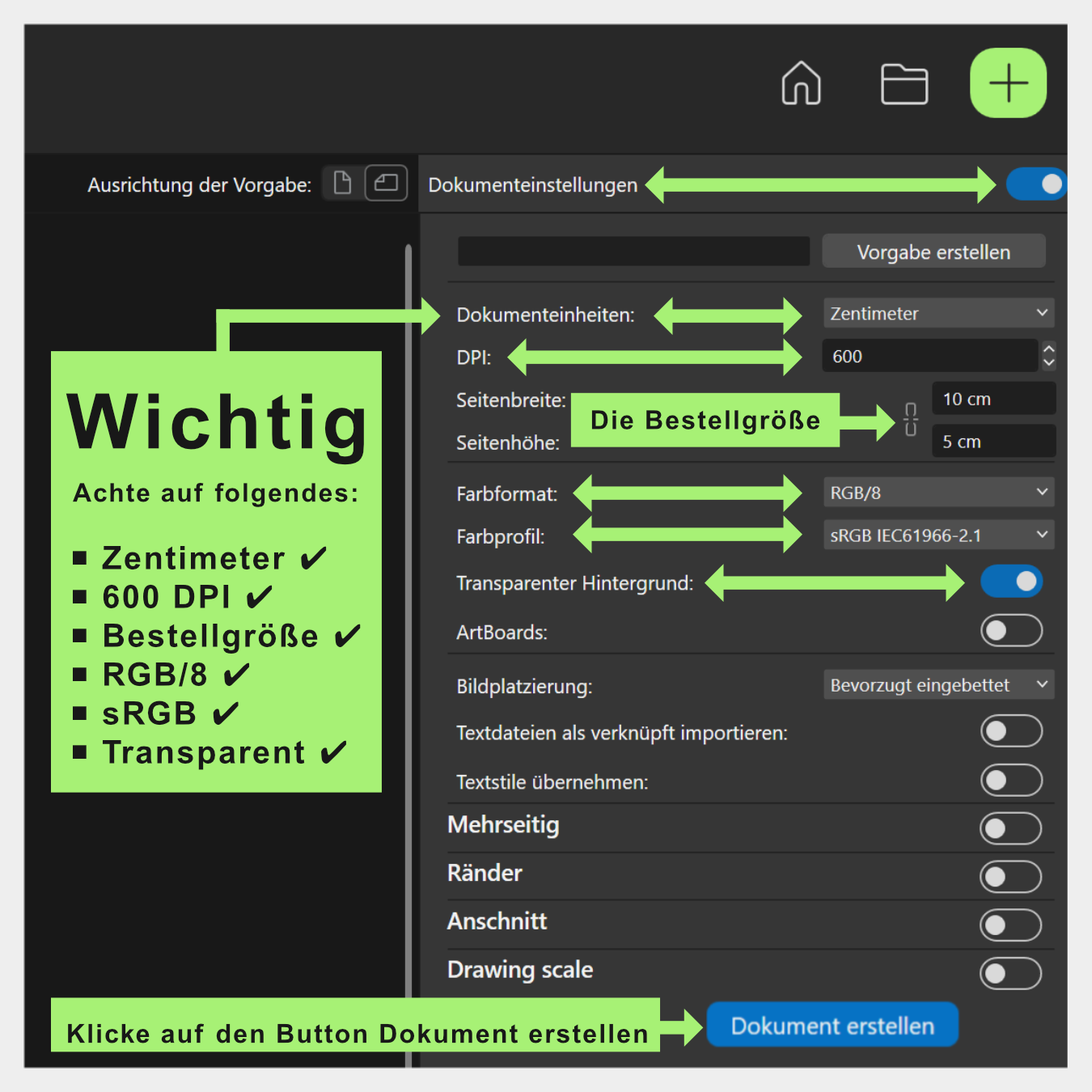 - ⚠ Exportiere die Datei 1:1 in Übereinstimmung mit der bestellten Druckgröße.