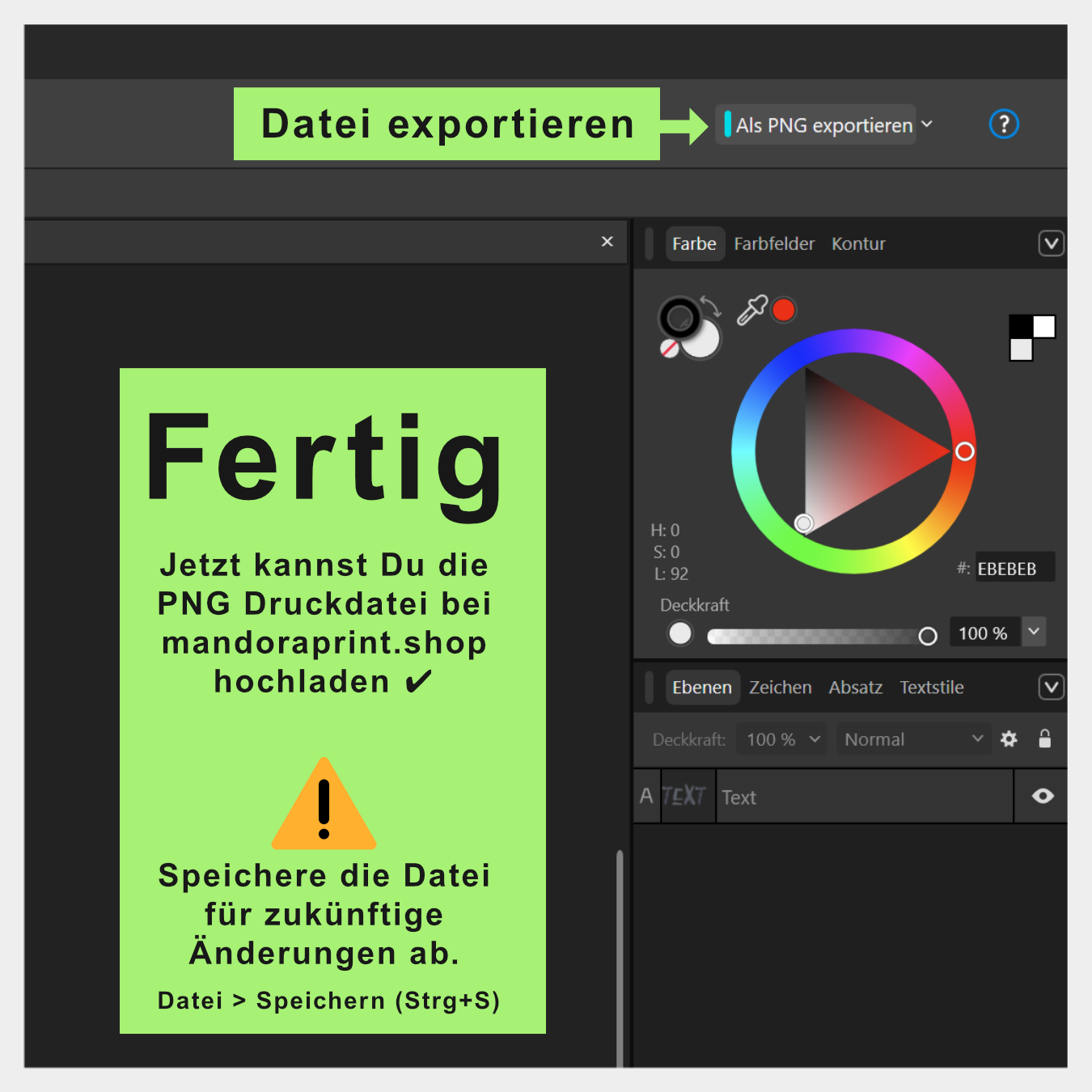 Klicke rechts oben und exportiere Dein Motiv im Dateiformat PNG. Diese PNG Datei kannst Du bei mandoraprint.shop in Mein Konto hochladen.